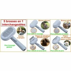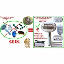 Vous adorez votre animal,offrez-lui le meilleur avec ce kit brossage multifonction 5 en 1 interchangeable,ecologique et manuel pour sa toilette quotidienne. Economisez en accessoire,de la place et surtout de l’argent avec ce set complet. Facile d’utilisation,respecte sa peau grâce aux différentes brosses et peignes étudiés pour lui. Convient à tout type de poils,long,court…